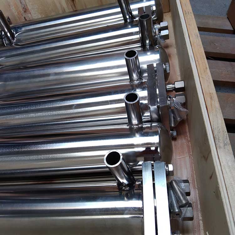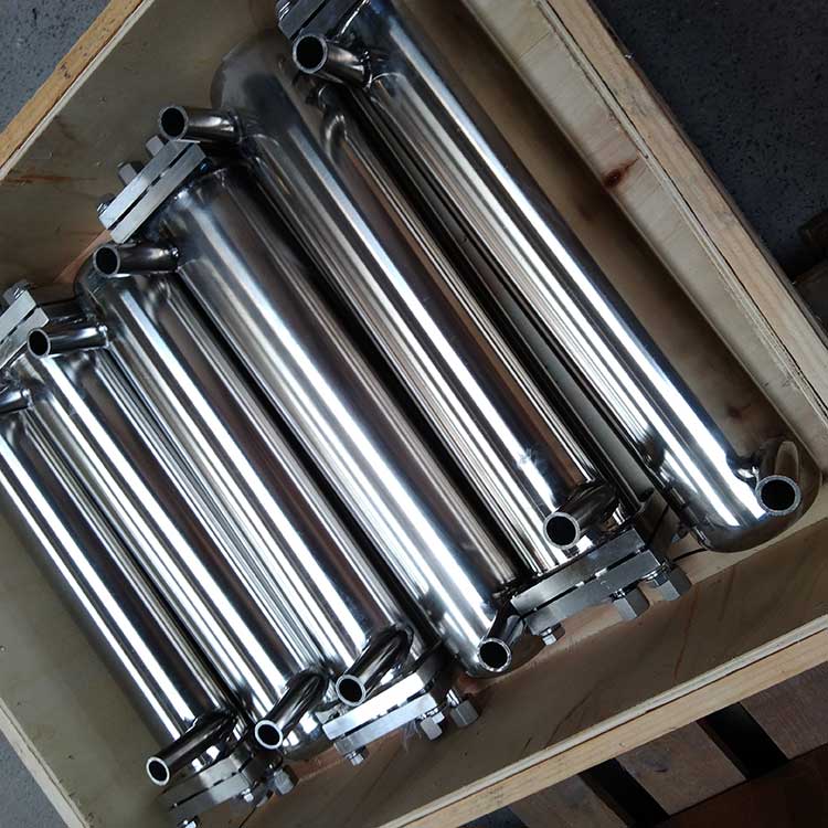 冷卻器由內(nèi)螺旋管、外螺旋管組成。共同安裝在一個(gè)筒體內(nèi)。外螺旋管在呈螺旋運(yùn)行的冷卻水中進(jìn)行熱交換;內(nèi)螺旋管在呈渦流運(yùn)動(dòng)的冷卻水中進(jìn)行熱交換,兩種冷卻水巧妙地匹配在一只冷卻器中進(jìn)行流動(dòng)。